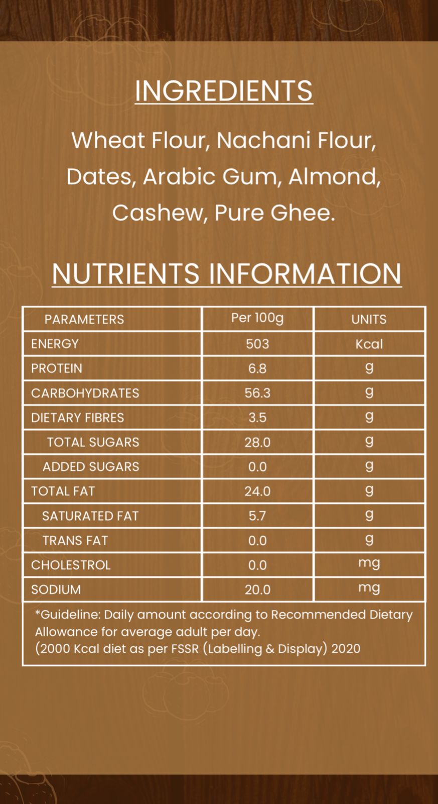 We start with nachani, a super grain rich in calcium and fiber, blend it with naturally sweet dates, and add a crunchy mix of premium nuts. No refined sugar, no shortcuts—just real ingredients, hand-rolled in pure ghee with love ♡.